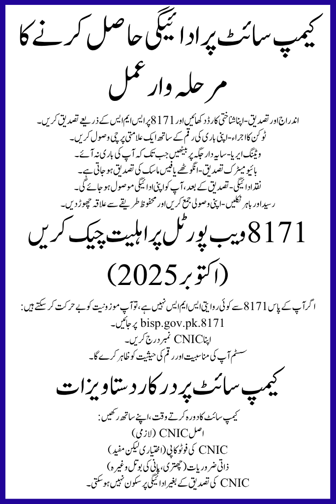 Lots of low-income relations across Pakistan obtain monetary assistance complete the Benazir Income Support Programme (BISP). To make the payment process faster, easier, and more transparent, the management has constant the initiative of BISP 8171 Campsites for the July–September 2025 installment, with expenditures consecutively into October 2025. These areas are intended to help fit women fold their funds easily without extended lines or deceit.