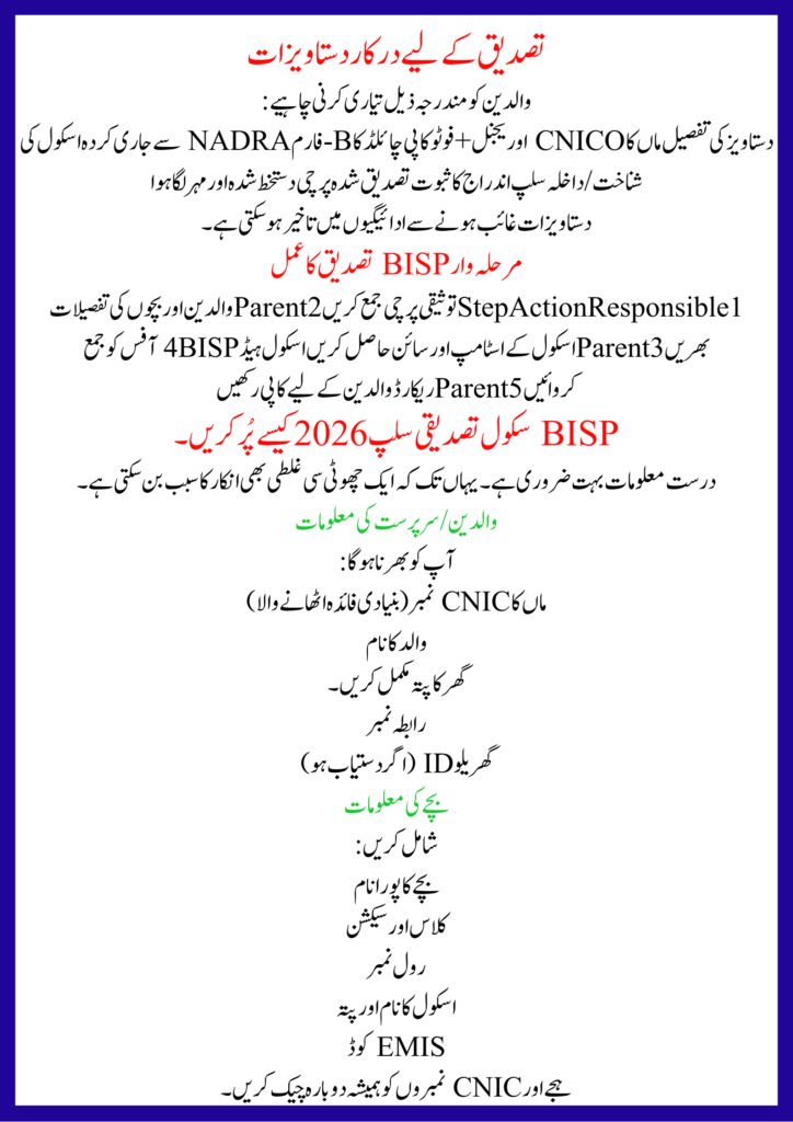 The BISP School Verification Slip 2026 is not just a form. It is a lifeline for education and financial stability for thousands of Pakistani families. By completing this simple process on time, parents ensure that their children stay in school and continue receiving Benazir Taleemi Wazaif without interruption.