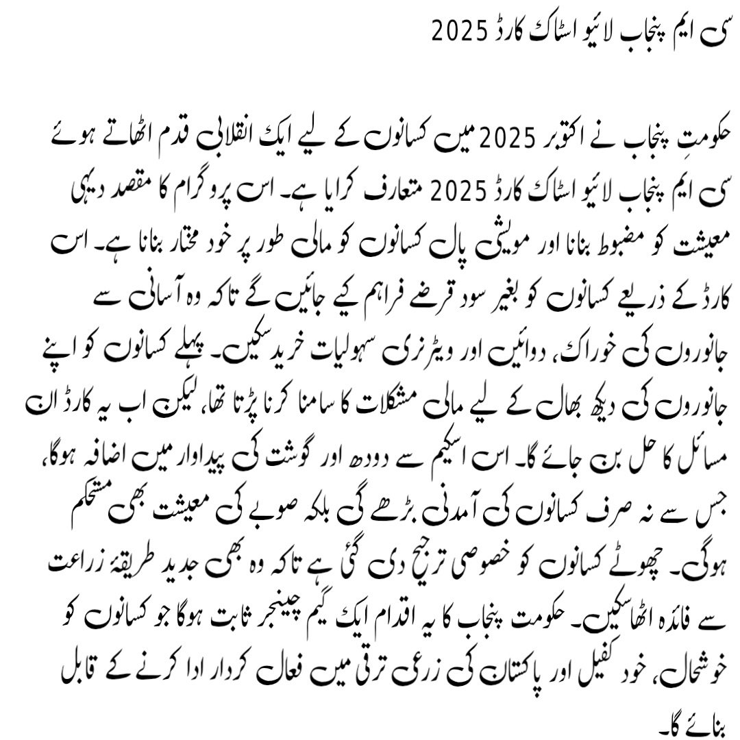 The CM Punjab Livestock Card 2025 is more than just a financial tool — it’s a vision to modernize agriculture, reduce rural poverty, and create a self-reliant farming community. Farmers across Punjab are encouraged to apply early and take advantage of this golden opportunity for growth and stability.