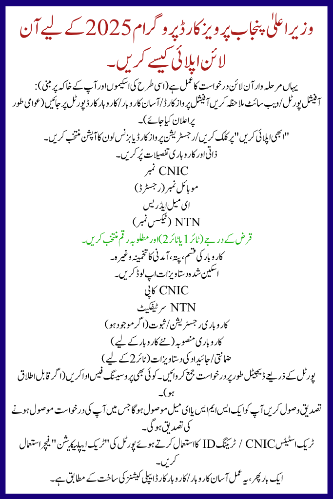 The CM Punjab Parwaz Card Program 2025 – Online Apply offers a important chance for entrepreneurs in Punjab to access interest-free business funding. With a simplified online application, tiered loan structure, and added support for women and youth, it is designed to foster business growth and service.