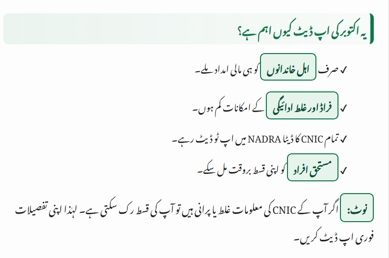 •  CNIC Re-Verification: Some families must verify their CNIC details again, especially if data is outdated or incomplete.