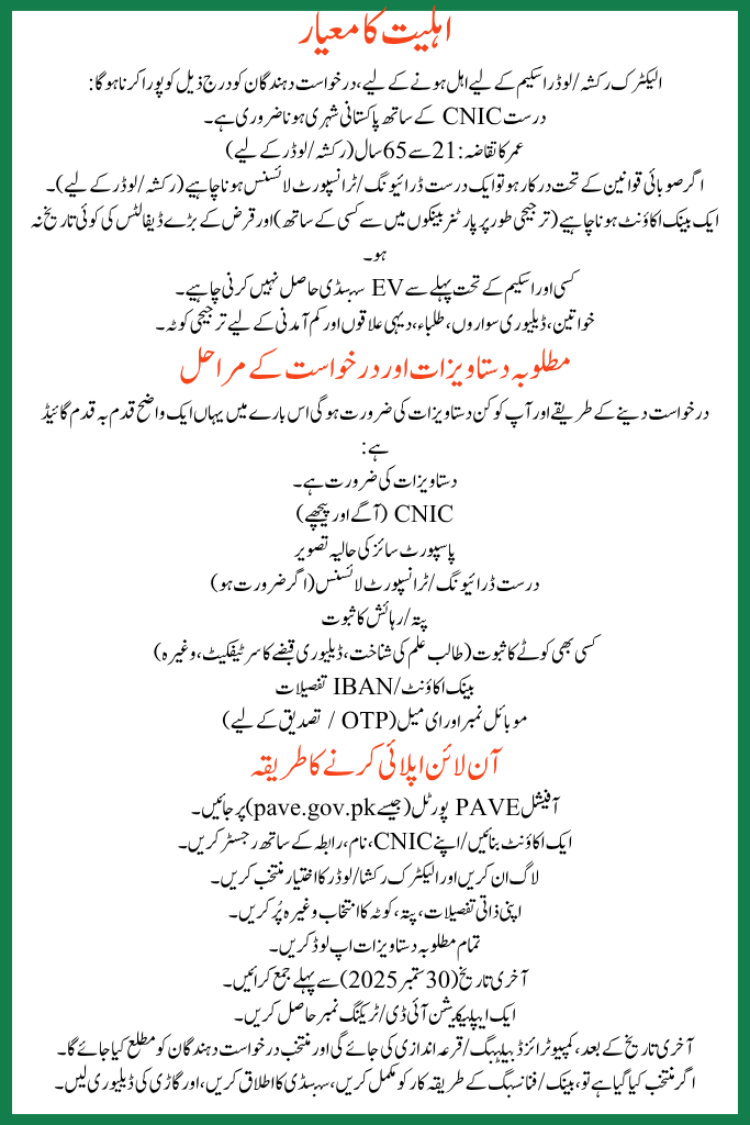 The Electric Rickshaw Scheme 2025 is a key component of Pakistan’s PAVE (Pakistan Accelerated Vehicle Electrification) program (2025–2030). It is designed to replace conventional petrol/CNG‑powered three‑wheelers with electric rickshaws (and loaders), making transportation cleaner, cheaper, and more sustainable for drivers across Pakistan.