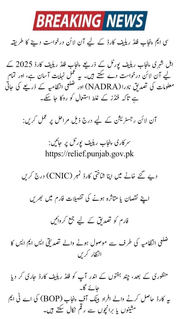 Eligible citizens can apply for the Punjab Flood Relief Card 2025 online through the Punjab Relief Portal using their CNIC number. The process is very simple, and all data is verified through NADRA and the District Administration to prevent any misuse of funds.