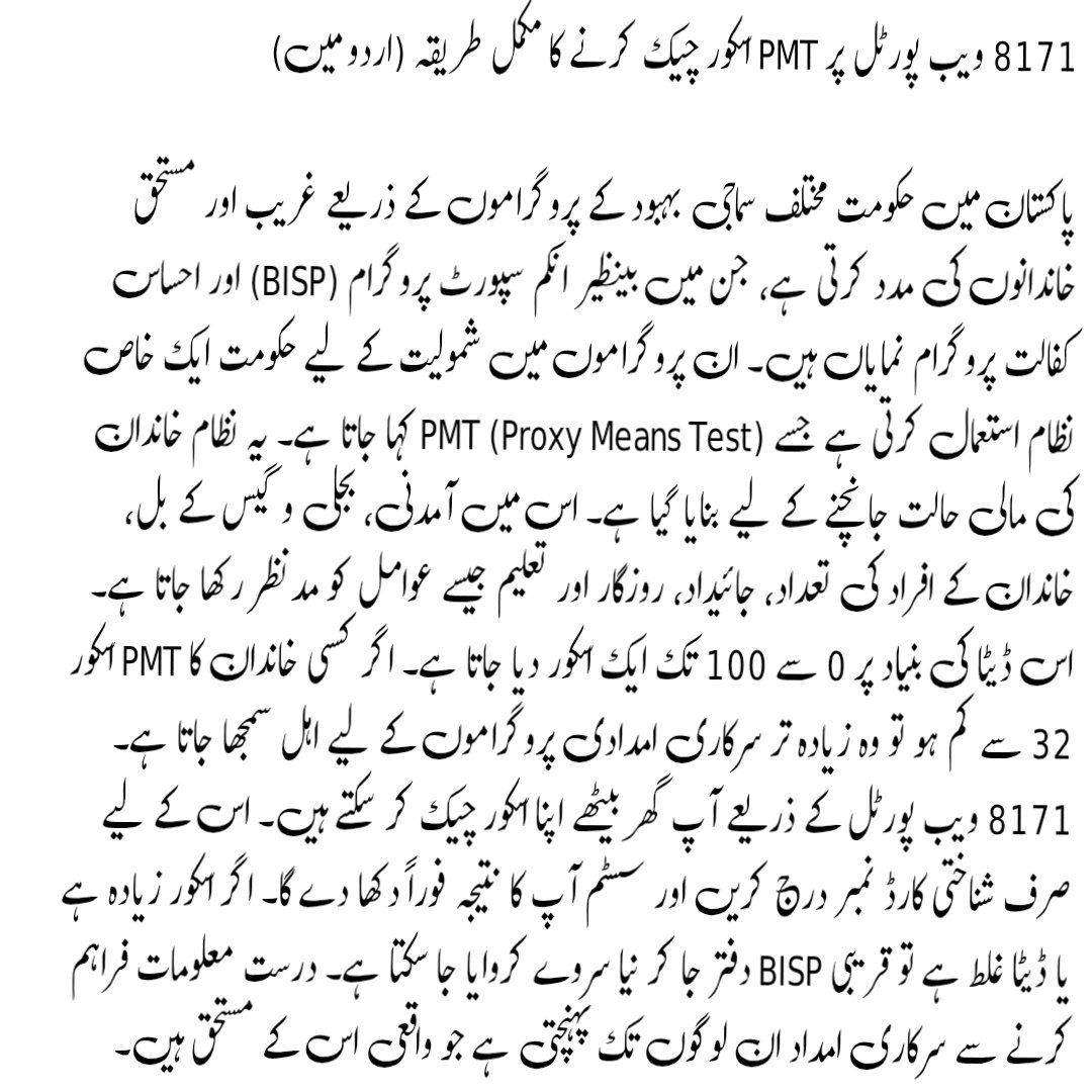 In Pakistan, thousands of families register for government assistance programs like the Benazir Income Support Programme (BISP) and Ehsaas Kafalat. Many applicants often receive a message saying “You are not eligible due to a high PMT score.” This creates confusion about what the PMT score actually means and how it affects eligibility. This article explains everything about the PMT score, how to check it on the 8171 web portal, and what to do if your score is higher than the required limit.