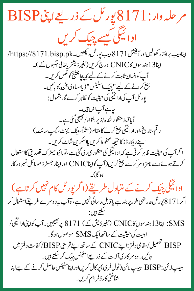 - SMS: Send your 13‑digit CNIC (without dashes) to 8171. You will get an SMS with your payment/eligibility status.