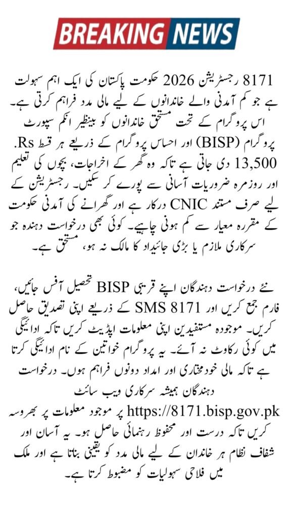 The 8171 Registration Process 2026 is a major welfare initiative by the Government of Pakistan to support low-income families through the Benazir Income Support Programme (BISP) and Ehsaas Program. This CNIC-based system ensures transparency, fairness, and timely financial assistance. With increasing living costs, the 8171 platform plays a critical role in helping deserving households meet basic needs across Pakistan.