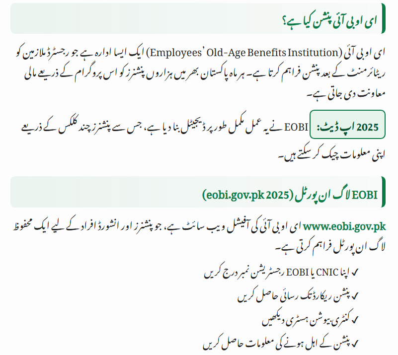 EOBI (Employees’ Old-Age Benefits Institution) provides pensions to registered employees after retirement. Every month, thousands of pensioners across Pakistan receive financial support through this program.
