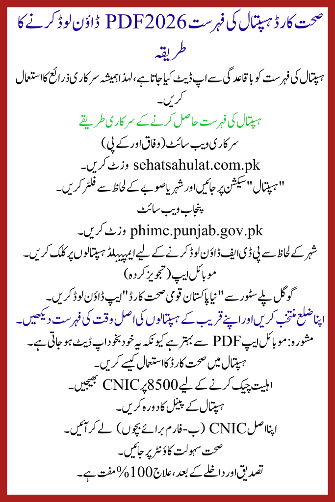 The New Sehat Card Hospital List 2026 PDF is updated regularly, so always use official sources.