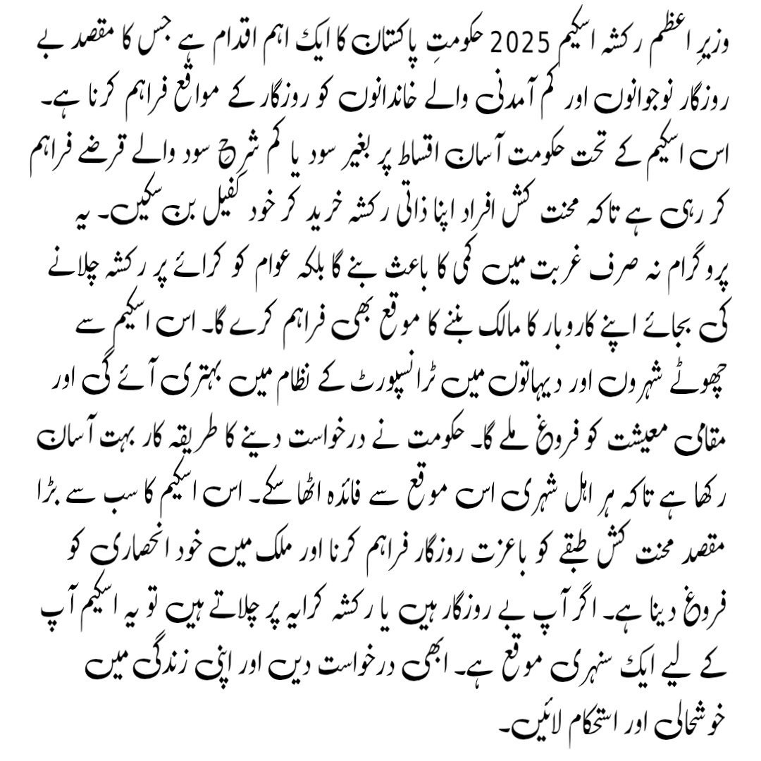 The Government of Pakistan has introduced the PM Rickshaw Scheme 2025, a powerful initiative aimed at empowering low-income families and unemployed youth. Through this program, the government is offering easy installment loans to help citizens purchase their own rickshaws and become self-employed. This scheme is a great step toward reducing poverty, promoting financial independence, and improving local transportation in small towns and cities.