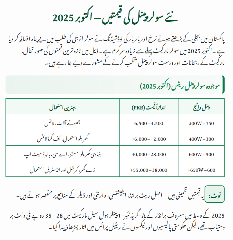In October 2025, New Solar Panel Prices in Pakistan reflect a mix of downward pressure from global oversupply and upward pressure from domestic taxes and policy shifts. A‑grade modules now typically range between PKR 28–35 per watt, with retail panel prices often landing between PKR 12,000 to 55,000+ depending on wattage.