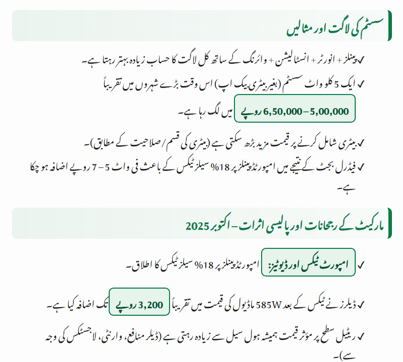 - A 5 kW system (excluding battery backup) is currently quoted in the range of PKR 500,000 – 650,000 in many major cities.