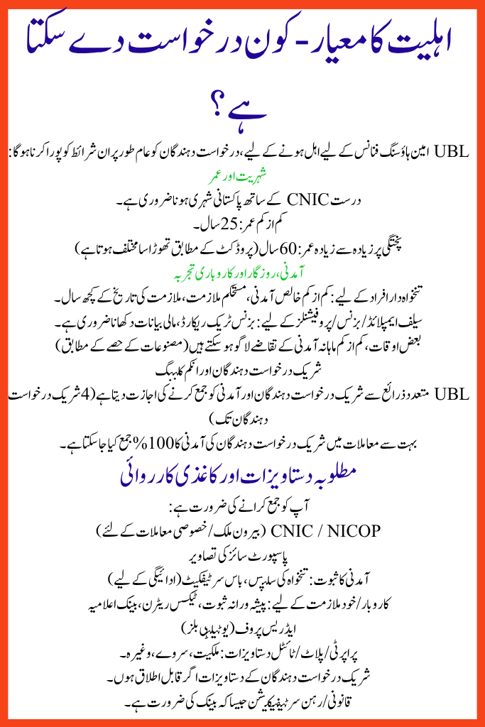 To qualify for UBL Ameen Housing Finance, applicants typically must meet these conditions: