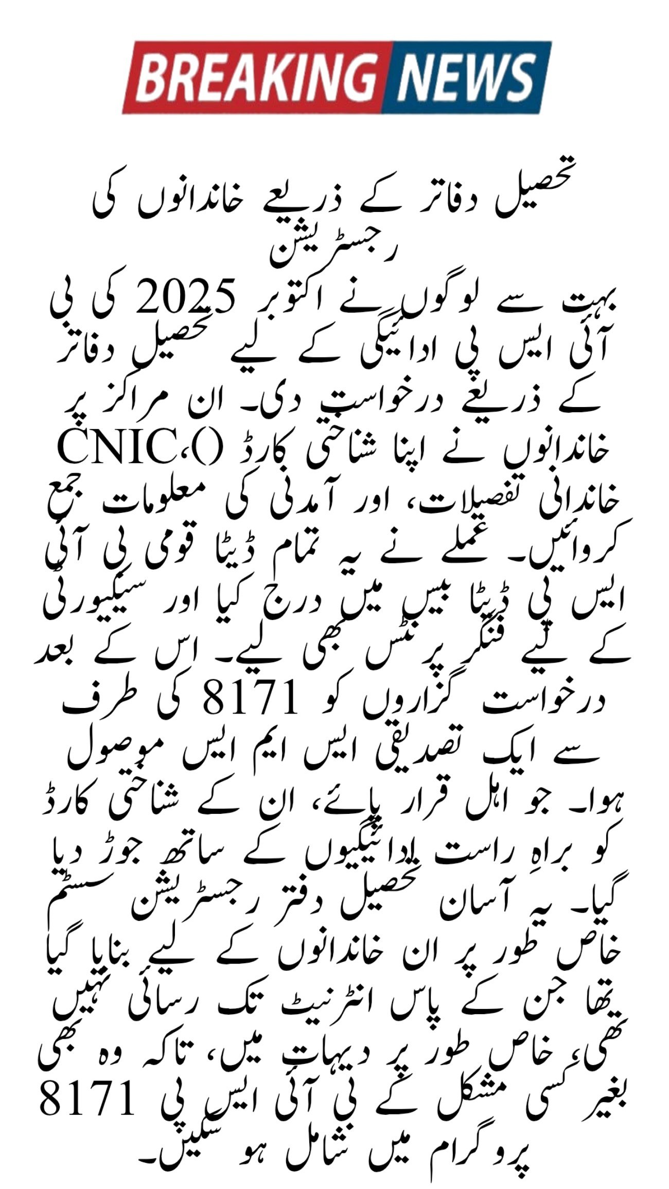 Many people applied for the BISP October 2025 Payment through Tehsil Offices. At these centers, families submitted their CNIC, family details, and income information. Staff members entered the data into the national BISP database and collected fingerprints for security. Afterward, applicants received a confirmation SMS from 8171. Those who were found eligible were linked to their CNIC for payments. This simple Tehsil office registration system was designed for families without internet access, especially in villages, so they could join the BISP 8171 program without difficulty.